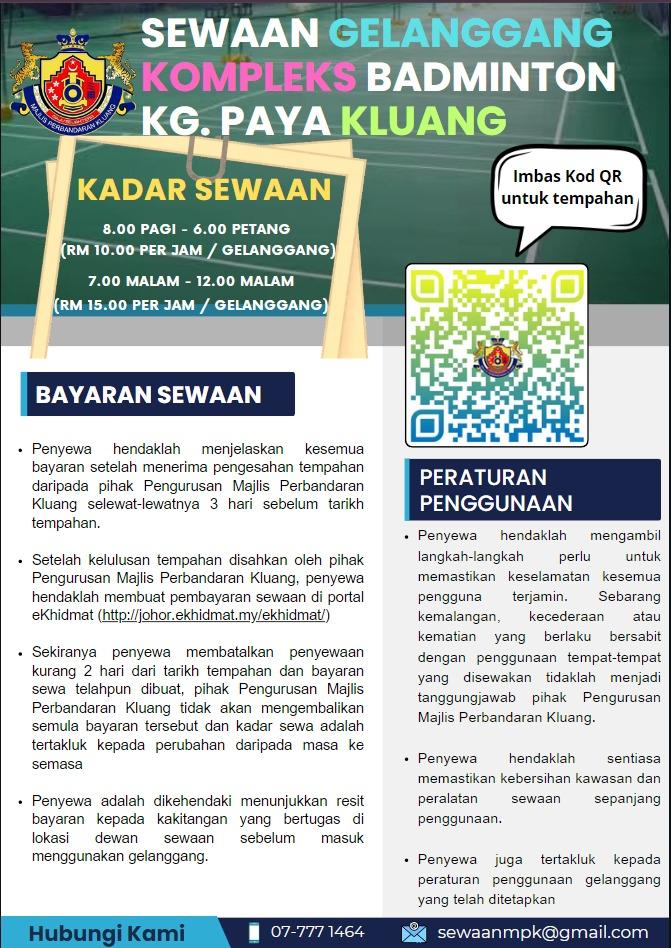 Berikut merupakan kadar pegangan bagi tahun 2024 di Kawasan Pentadbiran Majlis Perbandaran Kluang Sewaan Gelanggang Kompleks Badminton Kg Paya Kluang